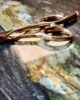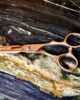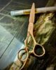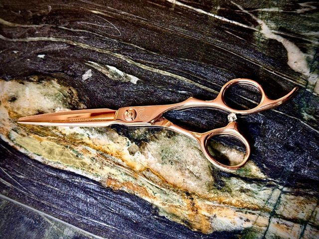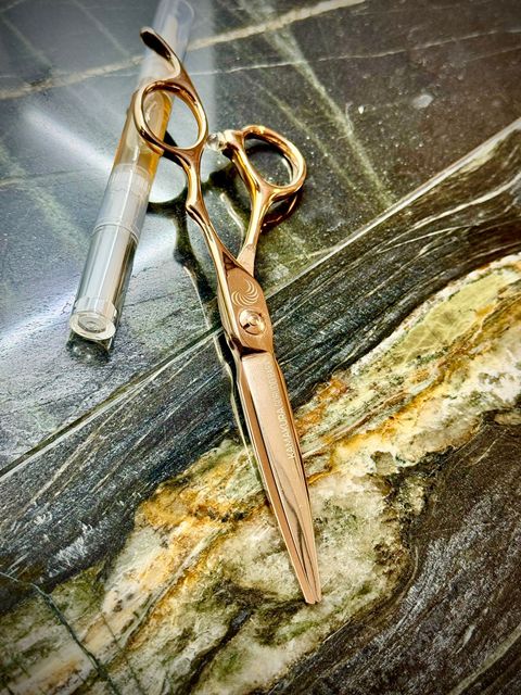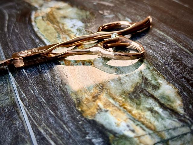 tijera ergonomica, filo tipo de navaja y tornillo integrado, apoyadedos fijo y curvo. Recubrimiento de Titanio Rose Golden.